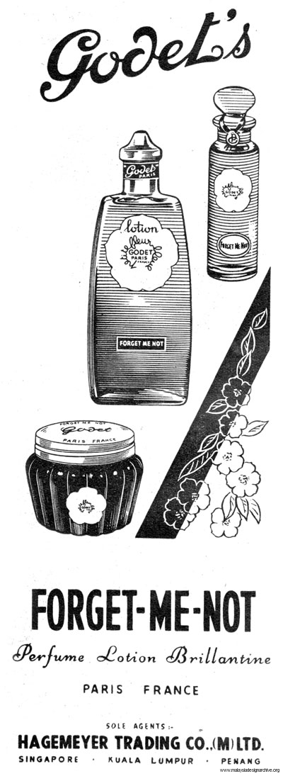 A Godet's Forget-Me-Not perfume ad published in 1954 'Filmalaya' magazine.